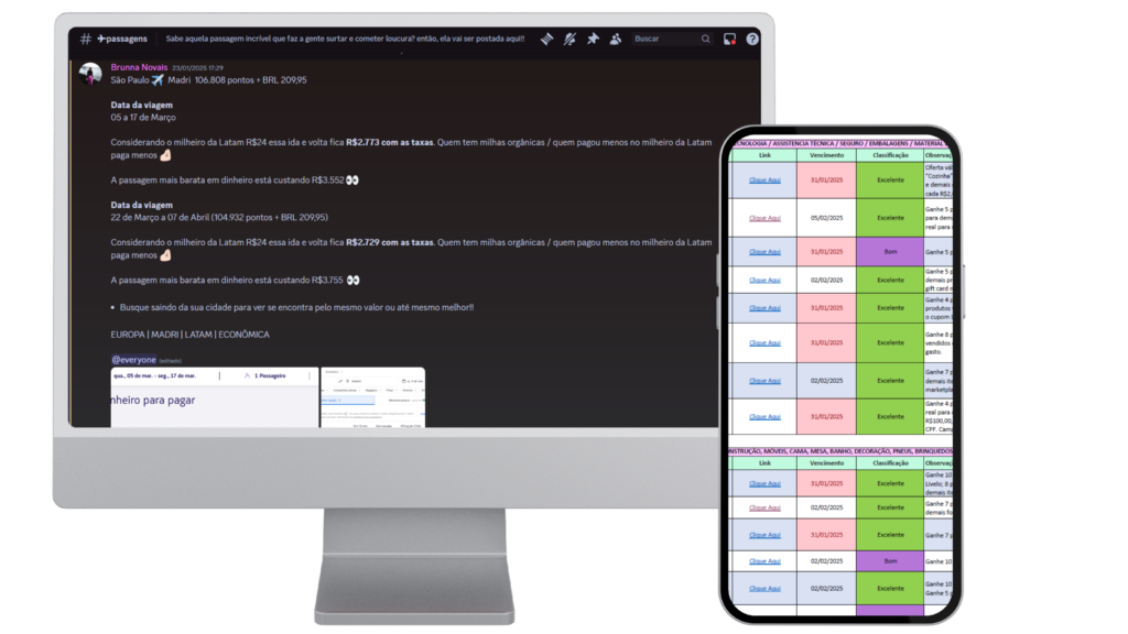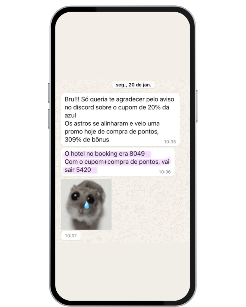 Além das aulas gravadas temos uma comunidade no Discord, onde enviamos de segunda a sexta as oportunidades de acúmulo de pontos, reservas de hospedagens e passagens aéreas.